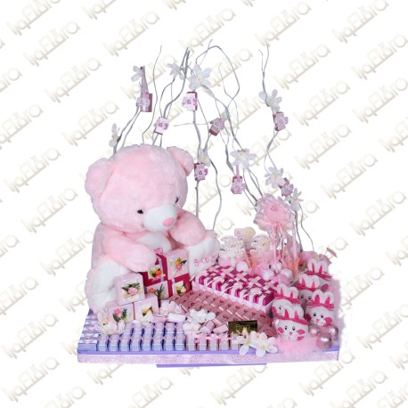 A baby girl arrangement decorated with teddy bear and baby accessories with luxurious chocolate